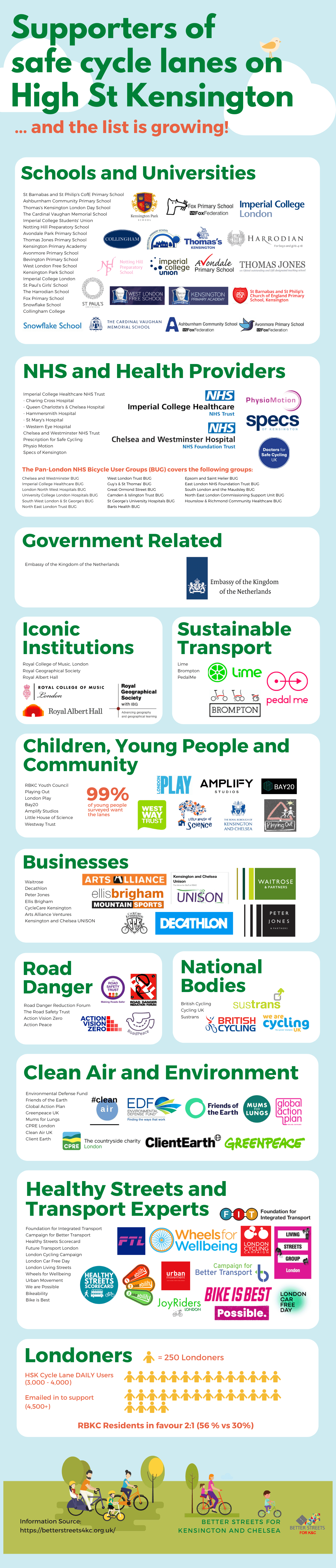 Our main point was that there is a serious lack of urgency to make High Street Kensington safe, nearly 2 and a half years after the protected cycle lanes were removed. Yet support from residents is there, as shown even in the unrepresentative sample gathered by the Citizens Panel. Twenty local schools, the Youth Council, the Chelsea and Westminster Hospital, other NHS trusts, the Royal Albert Hall, Imperial College London and business like Waitrose are all supportive of protected cycle lanes being introduced. Now we need action.